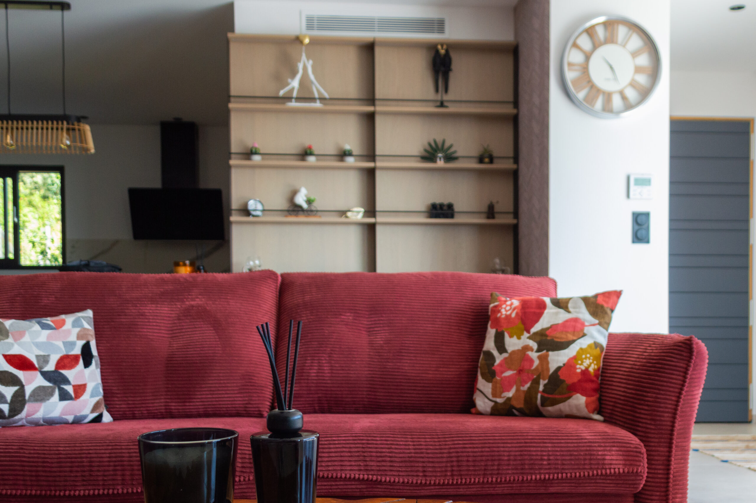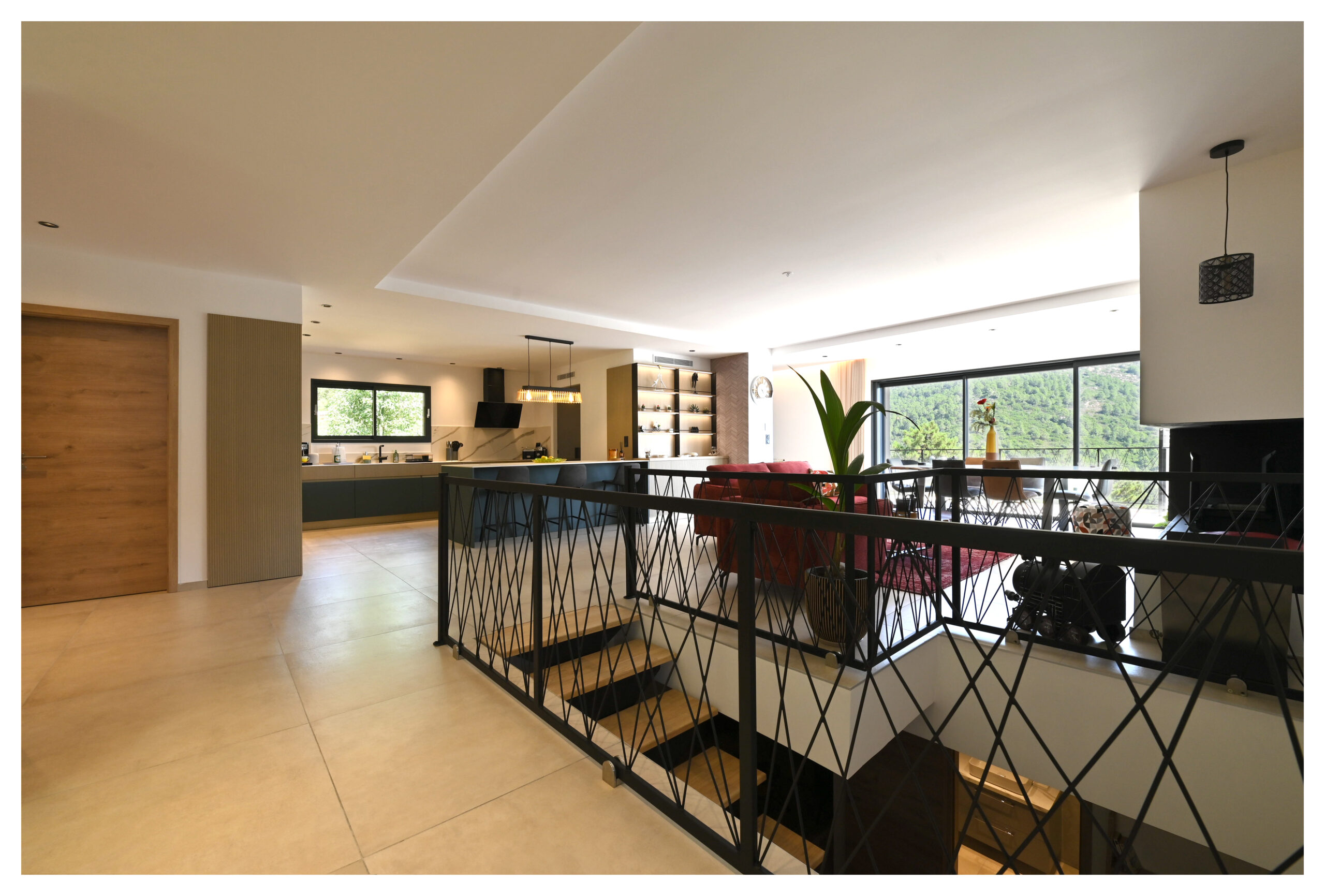 L’entrée s’ouvre sur une grande pièce à vivre lumineuse donnant sur la terrasse et la piscine.