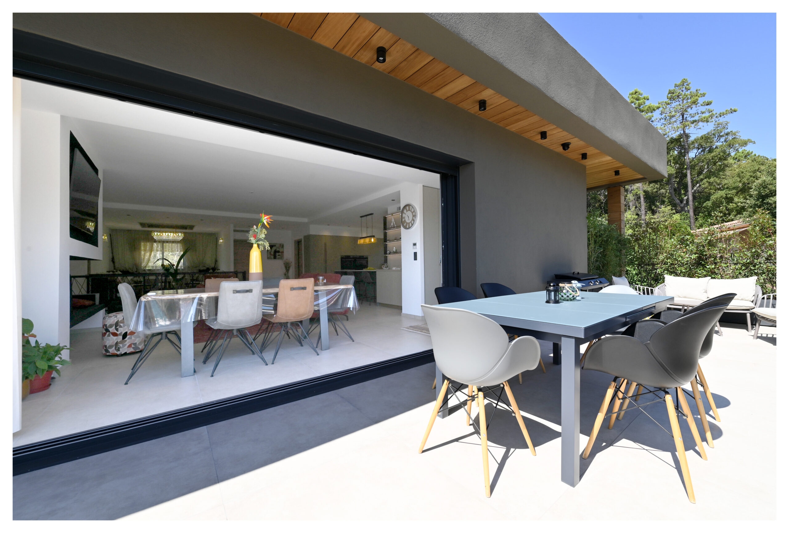 - Terrasse, table à manger, transats, salon de jardin, plancha
